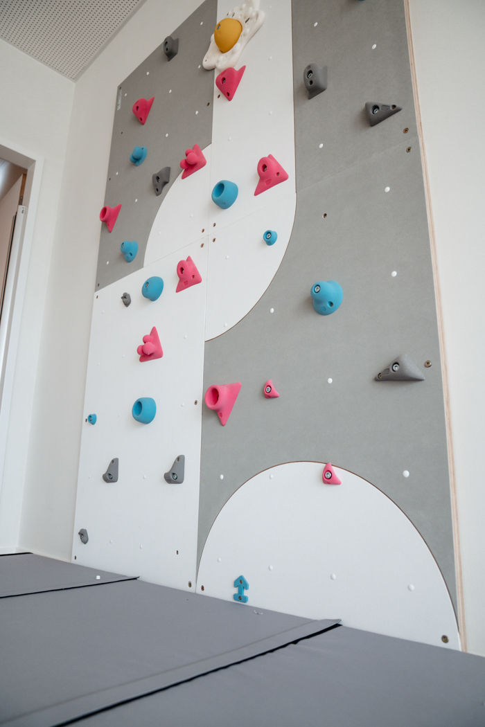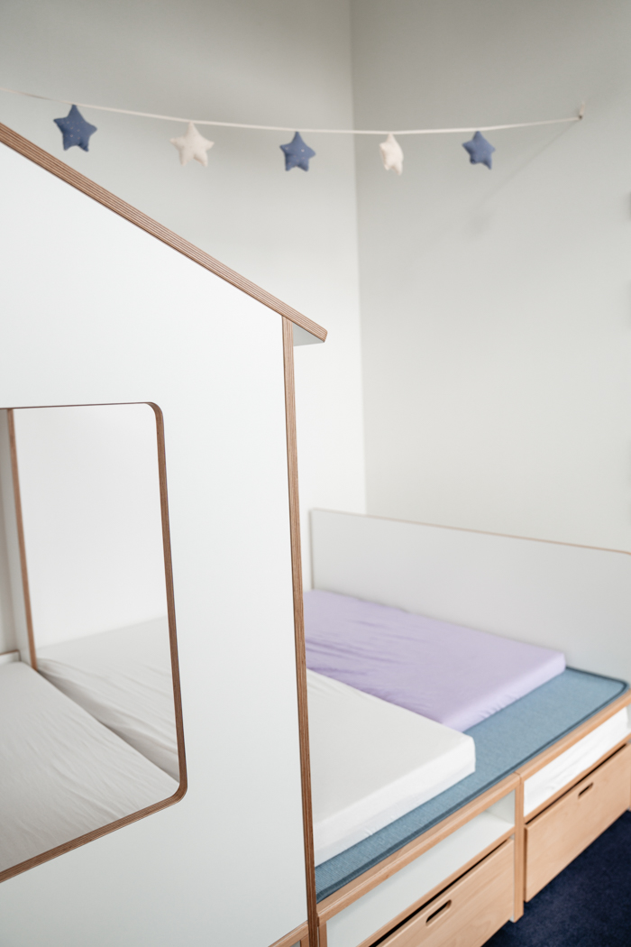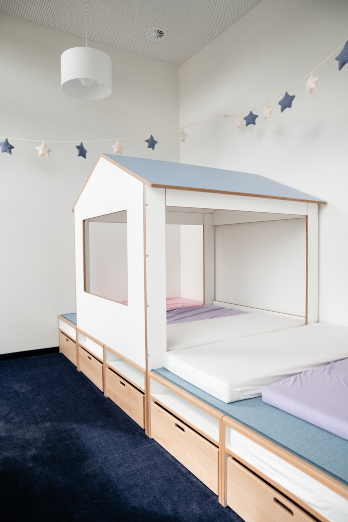 Ein direkt vom jeweiligen Gruppenraum zugängliches Badezimmer dient zur täglichen Hygiene. Ebenso direkt vom Grupperaum gelangt man in einen großzügigen Aktions-, Ruhe- und Lernraum bzw. in den Schlafraum.