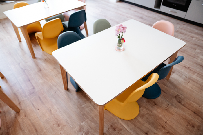 Im großzügigen Esszimmer mit der pädagogischen Küche verbringen wir auch gerne viel Zeit und backen auch oft mit den Kindern zusammen oder bieten Aktionen und Impulse darin an.