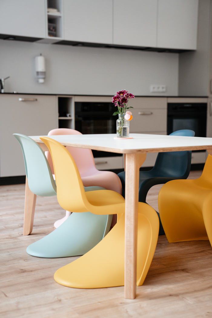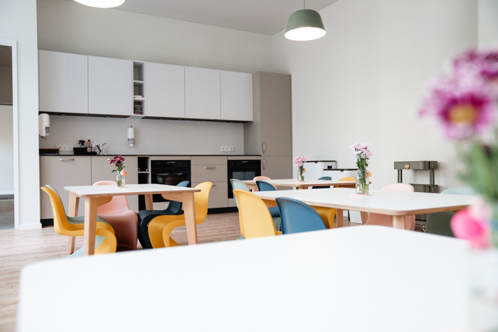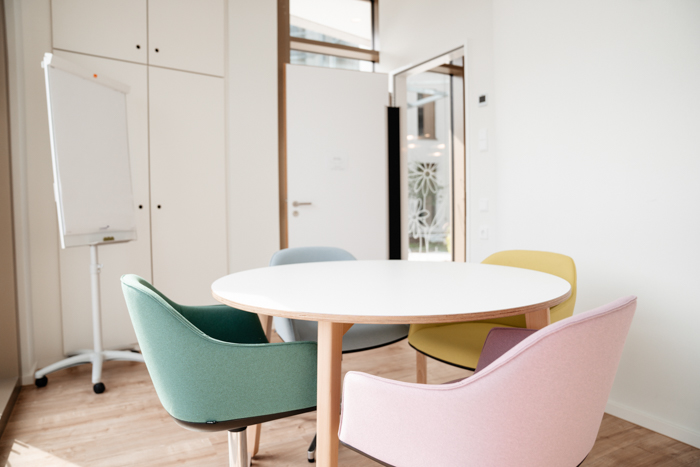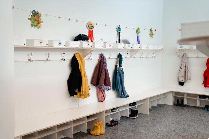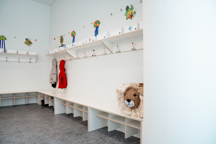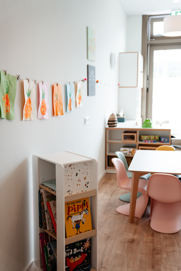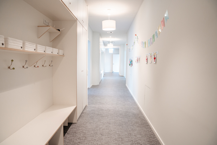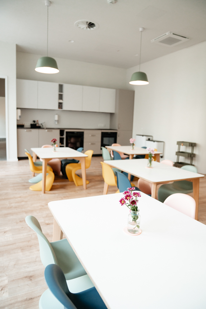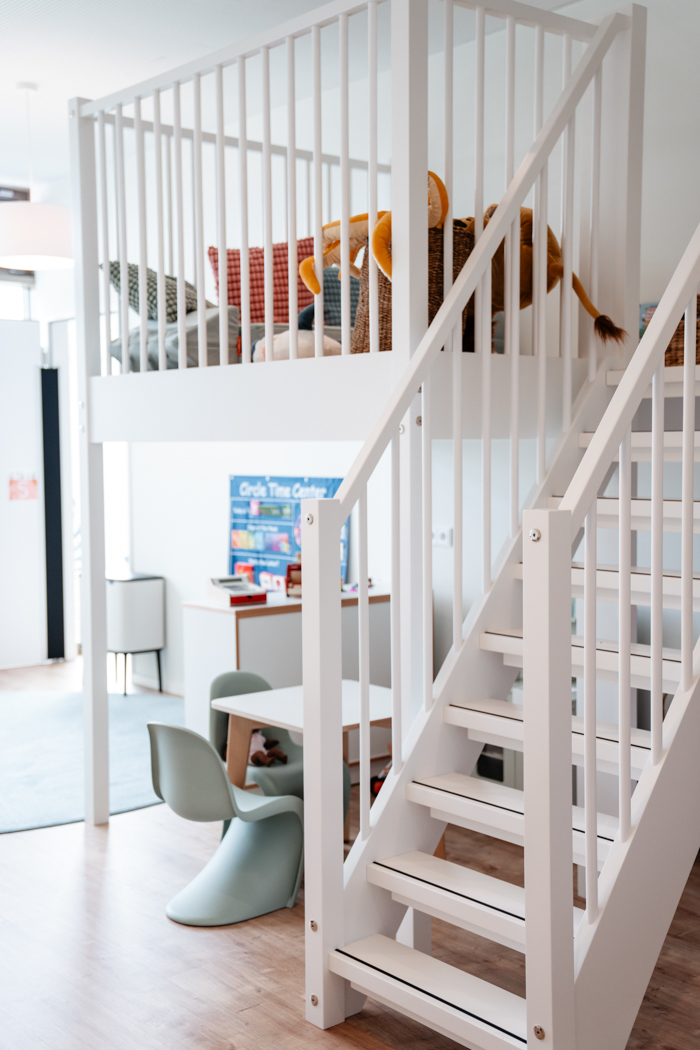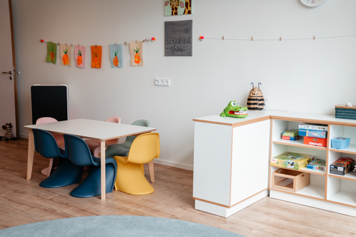 Auch der Regenerationsraum für unser Team ist vom zentralen Flur erreichbar. Das Büro der Hausleitung und einen separaten Besprechungsraum für ausgiebige Elterngespräche finden Sie leicht erreichbar im Eingangsbereich.