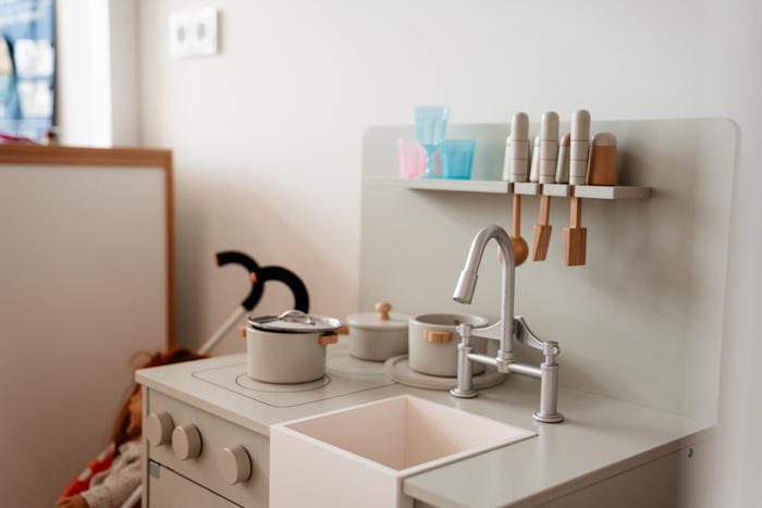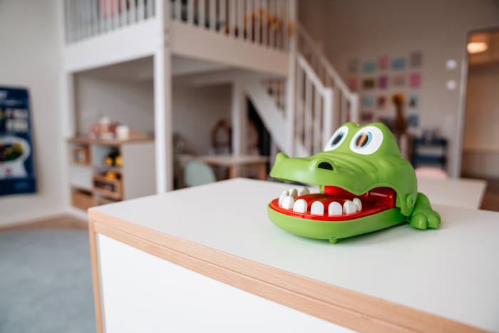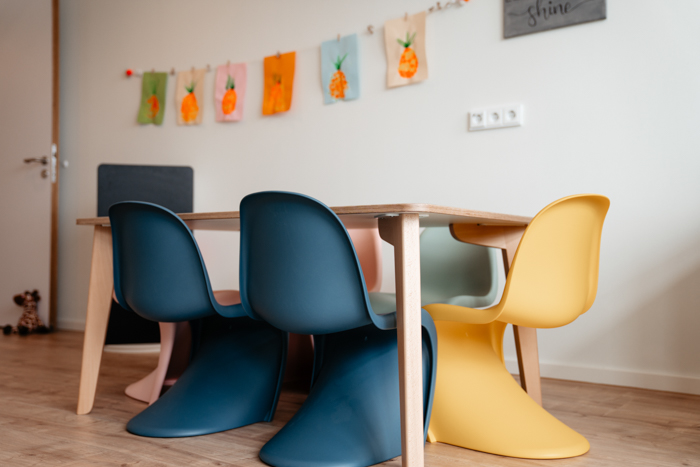 Im großzügigen Esszimmer mit der pädagogischen Küche verbringen wir auch gerne viel Zeit und backen auch oft mit den Kindern zusammen oder bieten Aktionen und Impulse darin an.